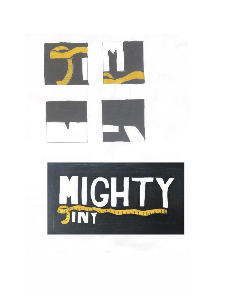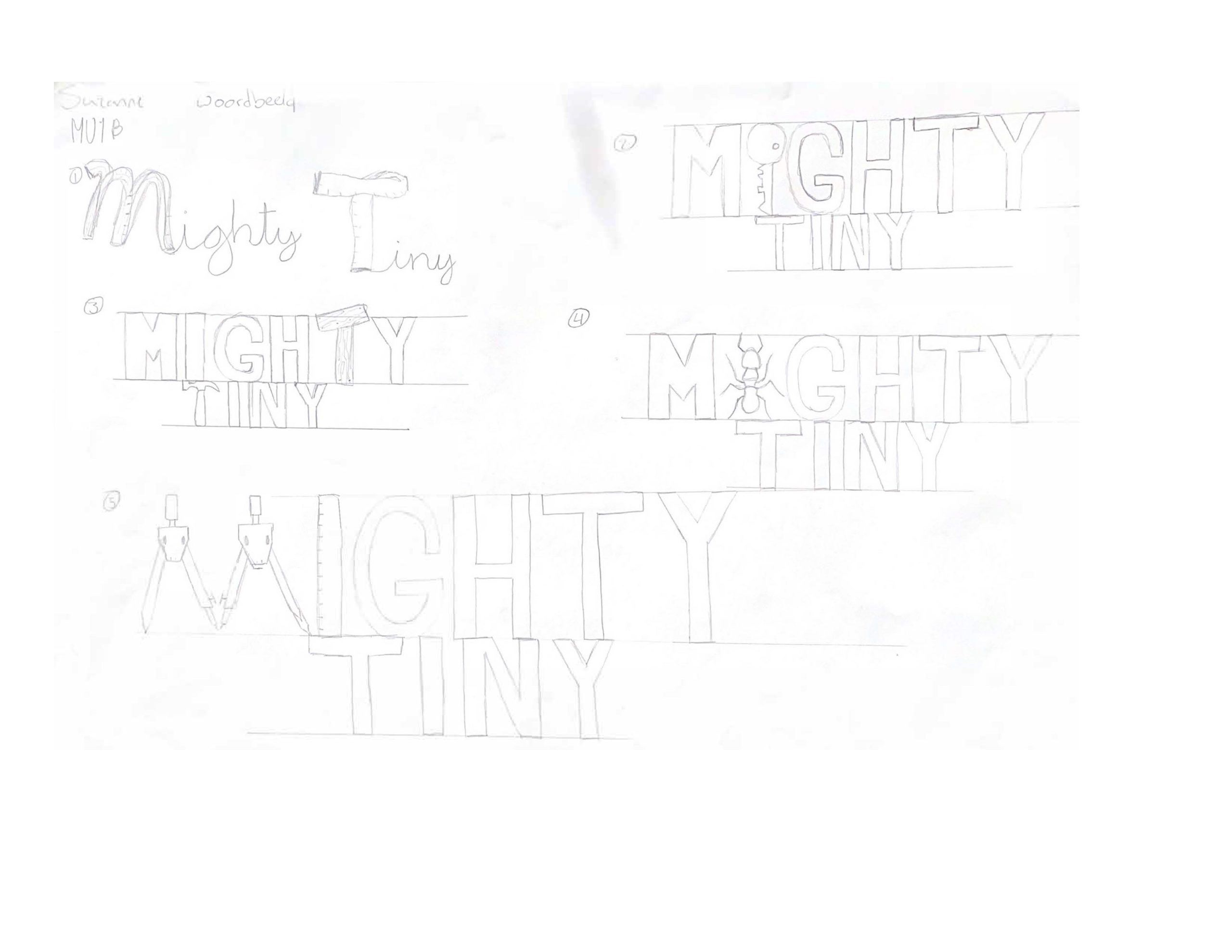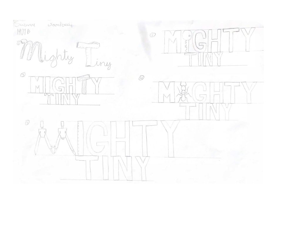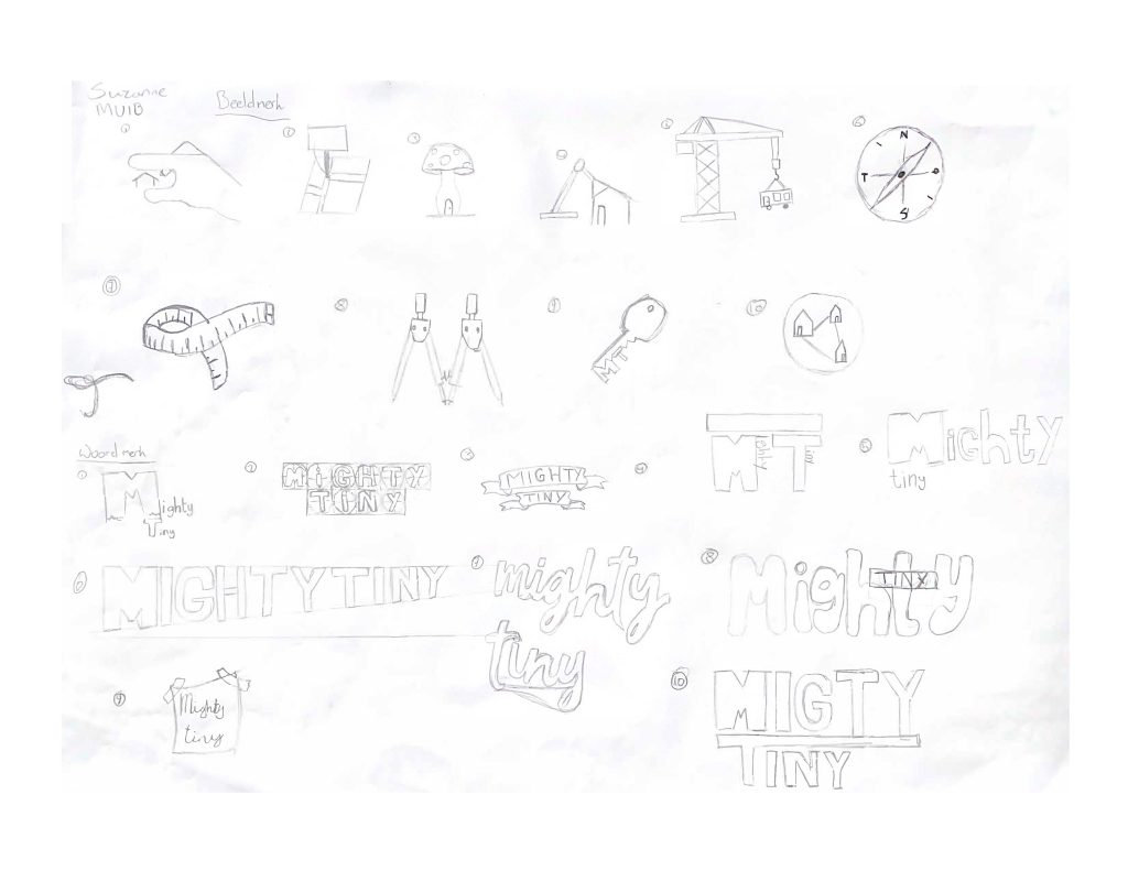 Ik begon met schetsen voor een logo. De merkwaarden van Mighty Tiny zijn: eenvoud, duurzaam en sociaal. Dit hield ik in mijn achterhoofd tijdens het schetsen.